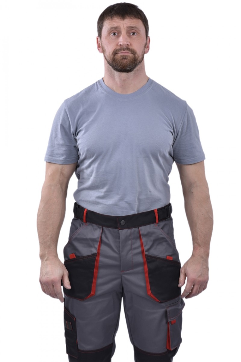 Брюки мужские с застежкой гульфика на тесьму «молния» и притачным поясом с красными шлевками. Передние половинки брюк с 2 боковыми накладными карманами с наклонным входом. На левой половинке в области колена дополнительный карман.